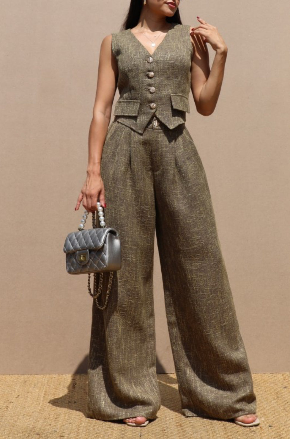 100% Polyester. No tiene stretch. El vest corre justo, pueden subir una talla.